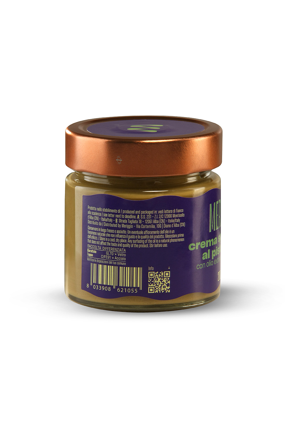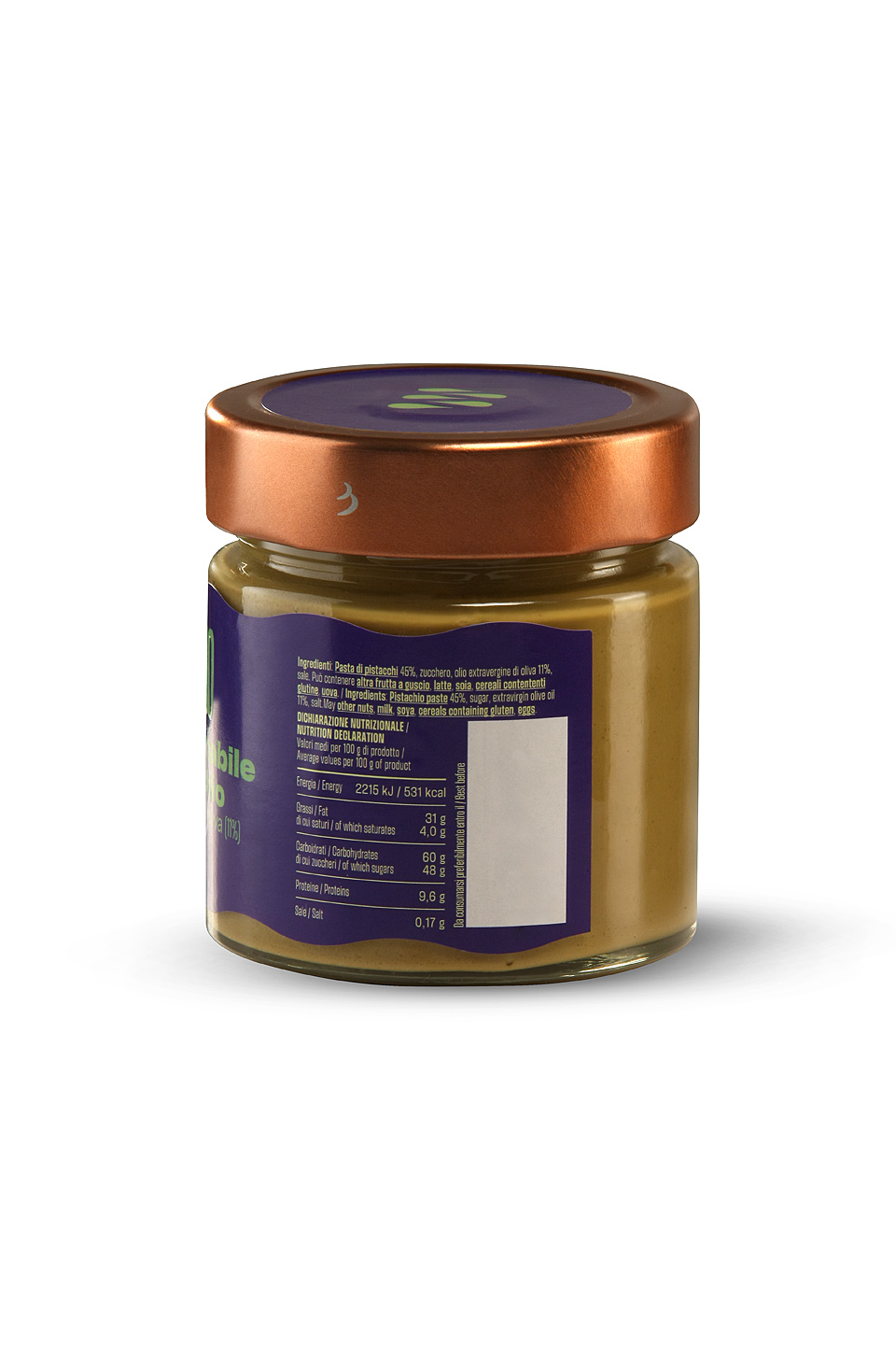 Pistacje (45%) cukier, 100% włoska oliwa Extra Virgin Meriggio (10%),